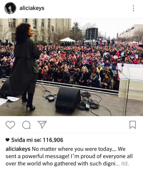 – Bez obzira gdje ste bili danas … Poslali smo snažnu poruku! Ponosna sam na sve diljem svijeta koji su se okupili s takvim dostojanstvom i velikom snagom poslali poruku da nećemo stati dok nas ne čuju! – napisala je slavna pjevačica Alicia Keys na svom službenom društvenom profilu.