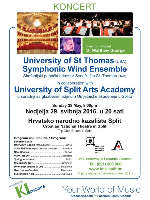 Simfonijski puhački ansambl Sveučilišta St. Thomas iz Sjedinjenih Američkih Država iz Minnesote, nastupit će u Hrvatskom narodnom kazalištu Split u nedjelju 29. svibnja 2016. godine s početkom u 20,00 sati. Koncert je organiziran u suradnji s Umjetničkom akademijom u Splitu, a njime će ravnati stalni dirigent Orkestra, maestro Mathew J. George. Na programu su djela američkih skladatelja koja su dio stalnog repertoara ovog sveučilišnog orkestra, te djela Vlade Sunka i Jakova Gotovca koje je Orkestar za ovu priliku uvrstio u svoj repertoar.