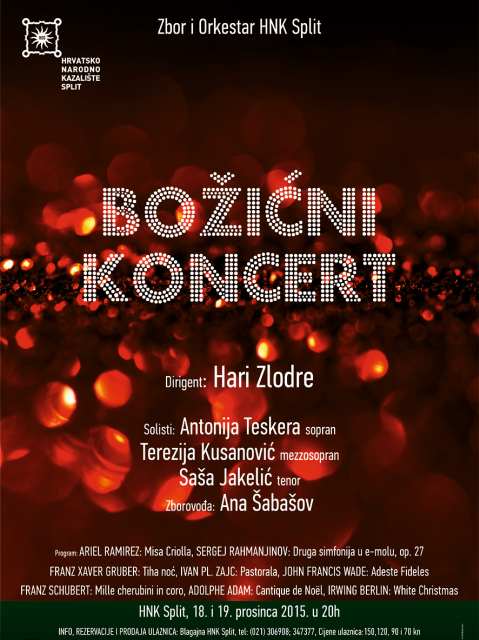 Zbor i Orkestar Hrvatskog narodnog kazališta Split pod ravnanjem maestra Harija Zlodre izvest će tradicionalni Božićni koncert u petak i subotu 18. i 19. prosinca 2015. godine s početkom u 20,00 sati. Kao solisti nastupit će sopranistica Antonija Teskera, mezzosopranistica Terezija Kusanović, tenor Saša Jakelić, te klarinetist Željko Milić, dok je zborovođa Ana Šabašov. Na programu su djela Ramireza, Rahmanjinova, Grubera, Zajca, Wadea, Schuberta, Adama i Berlina.