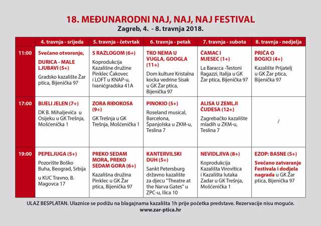 Sve je spremno za početak 18. međunarodnog Naj, naj, naj festival, koji će u srijedu 4. travnja s početkom u 11.00 sati u Gradskom kazalištu Žar ptica, kako se očekuje, svečano otvoriti gradonačelnik Grada Zagreba Milan Bandić.