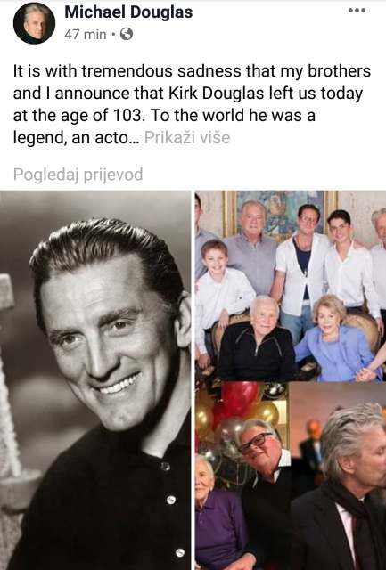 – Moja braća i ja u velikoj boli i tuzi objavljujemo da nas je Kirk Douglas napustio danas sa 103 godine. Za svijet je on bio legenda, glumac iz zlatnog doba filmova koji je doživio zlatne godine, humanitarac čija je predanost pravdi i ciljevima u koje je vjerovao bio standard kojemu svi težimo. No, meni i mojoj braći on je bio samo tata, Catherine je bio predivan svekar, unucima i praunucima voljeni djed, a njegovoj supruzi Anne predivan suprug. Kirk je živio lijep život, svijetu ostavlja filmsku ostavštinu koja će biti tu za generacije koje dolaze. Bio je ugledni filantrop koji je radio na pomaganju javnosti i donošenju mira planetu – napisao je Michael Douglas.