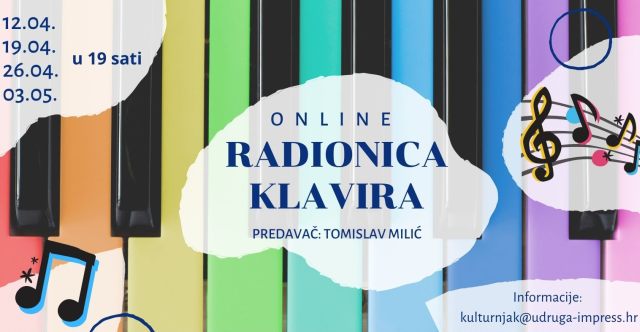 – Ovim putem Vas pozivamo da se priključite na online Radionicu klavira koju vodi Tomislav Milić, vrhunski pijanist, akademski muzičar i cijenjeni profesor. Besplatna radionica će se održati online u četiri termina (12.4., 19.4., 26.4. i 3.5.) od 19 do 20:30 h za osobe mlađe od 25 godina koje žele naučiti osnove sviranja klavira, a za grupu polaznika starijih od 54 godine 10.5., 17.5., 24.5. i 31.5. od 19:00 do 20:30 h. Za sudjelovanje na radionici klavira potrebna Vam je klavijatura, kajdanka, papir i olovka. Svi zainteresirani se mogu prijaviti putem online obrasca, a za sve dodatne informacije na kulturnjak@udruga.impress.hr.