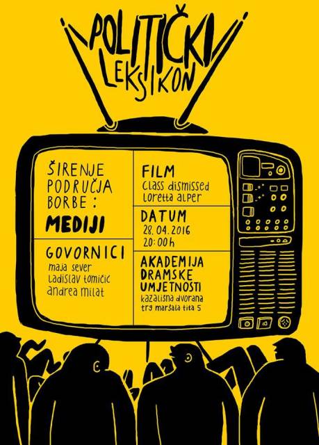 Politički leksikonNa Akademiji dramske umjetnosti Sveučilišta u Zagrebu ovog se tjedna održava treća tribina ciklusa ‘Politički leksikon’ koji organiziraju sadašnji i bivši studenti te profesori Akademije. Ovotjedna tribina na temu medija održat će se u četvrtak, 28. travnja 2016. godine, u 20,00 sati u Kazališnoj dvorani Akademije (Trg maršala Tita 5).