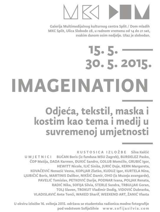 U petak 15. svibnja 2015. godine, u 20,00 sati, u galeriji Multimedijalnog kulturnog centra Split na programu je svečano otvorenje izložbe ‘Imageination‘. Riječ je o izložbi radova u raznim medijima i područjima suvremene umjetnosti, koji se tiču i uzimaju kao svoj materijal tekstil (draperiju, tkanje…), odjeću (modnu, anti-modnu, odjeću kao ready-made, kao kostim ili maska tj. kao potvrdu ili način promjene ili negacije identiteta) ili prisvajaju modne strategije poput omatanja, nabiranja,