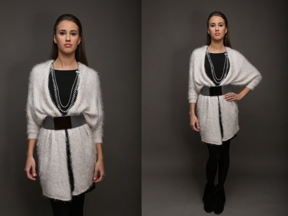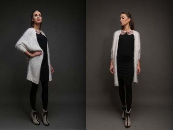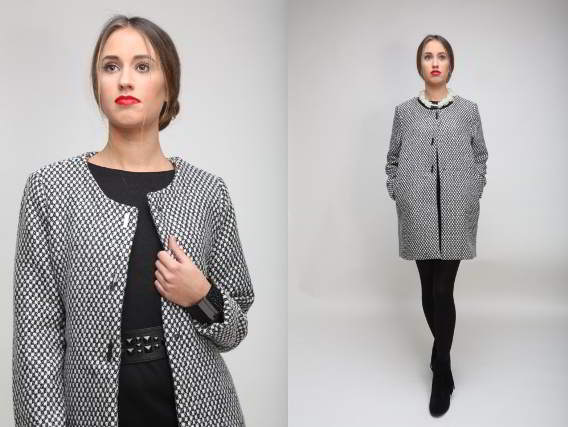 Haljini smo dodali ravno krojeni kaput sitnog, kvadratičnog crno-bijelog uzorka. Kao dodatak možete nositi bogate uz vrat ogrlice jer je kaput okruglog izreza bez ovratnika ili će te samo dodati stilizirani remen na haljinu. Posebnost ove kombinacije čini lagano pletena punđa a make up uz malo naglašene oči usta se ističu raskošnim crvenim ružom.