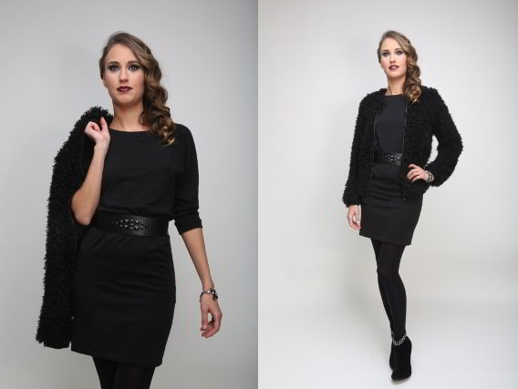 Večernju varijantu može činiti klasična crna kombinacija a haljinu smo oplemenili stiliziranim remenom i modernom jaknom bogate baršunaste teksture. Crne grilon čarape i elegantne gležnjače savršeno pristaju ovoj kombinaciji. Boje se ističu u make up-u a frizura je raspuštena te pada u blagim stiliziranim kovrčama.