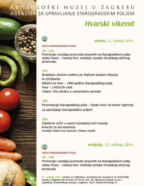 U suradnji s Agencijom za upravljanje Starogradskim poljem, Arheološki muzej u Zagrebu povodom Europske noći muzeja ugošćuje 21. i 22. svibnja 2016. godine hvarske poljoprivrednike okupljene pod jedinstvenim nazivom Okusi polja, a predstavit će nam svoje proizvode koji su uzgajaju još od dolaska starih Grka.