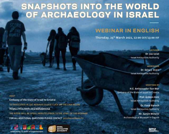U četvrtak, 25. ožujka 2021. godine s početkom u 12.00 sati održat će se online predavanje Kratki pogled u svijet arheologije u Izraelu u organizaciji Izraelske uprave za starine, Veleposlanstva Države Izrael u Hrvatskoj i Arheološkog muzeja u Zagrebu.