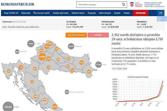 U protekla 24 sata zabilježena su 2.362 nova slučaja pa je broj aktivnih slučajeva u Hrvatskoj danas ukupno 16.926. Među njima je 1.710 pacijenata na bolničkom liječenju, od toga su na respiratoru 194 pacijenta. Preminule su 43 osobe. Do danas je ukupno zabilježeno 84.206 osoba zaraženih novim koronavirusom, od kojih je 1.049 preminulo, a 66.231 se oporavilo (2.483 u protekla 24 sata). U samoizolaciji su trenutno 38.824 osobe. Do danas su ukupno testirane 619.532 osobe, od toga 8.175 u posljednja 24 sata.