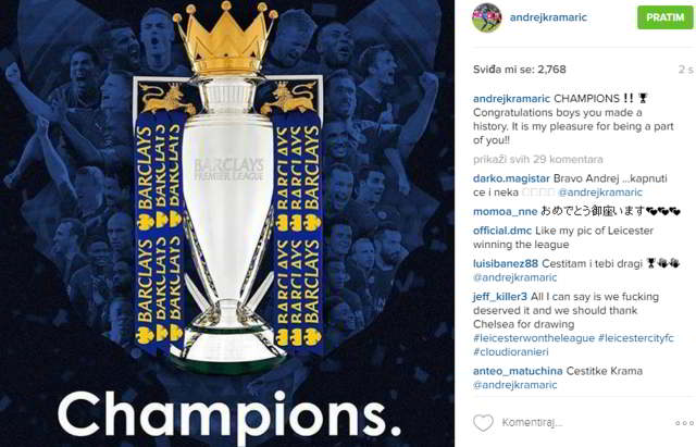 – Čestitke dečkima, vi ste ispisali povijest. Zadovoljstvo mi je biti dio vas – napisao je Andrej Kramarić na društvenoj mreži nakon što je završila i posljednja utakmica odluke i Leicester City postao novi prvak Engleske Premier Lige.