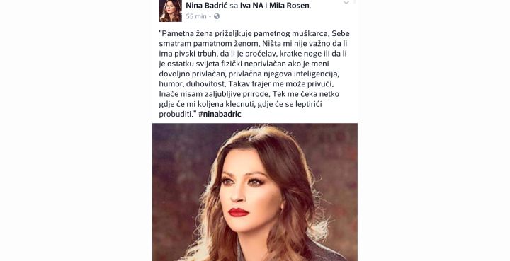 – Pametna žena priželjkuje pametnog muškarca. Sebe smatram pametnom ženom. Ništa mi nije važno da li ima pivski trbuh, da li je proćelav, kratke noge ili da li je ostatku svijeta fizički neprivlačan ako je meni dovoljno privlačan, privlačna njegova inteligencija, humor, duhovitost. Takav frajer me može privući. Inače nisam zaljubljive prirode. Tek me čeka netko gdje će mi koljena klecnuti, gdje će se leptirići probuditi – napisala je Nina Badrić ispod fotografije koju je objavila na društvenoj mreži.