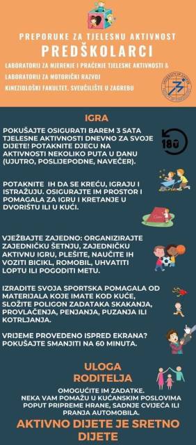 – Djetinjstvo je razdoblje života obilježeno snažnom unutrašnjom potrebom za kretanjem, a u ovim izvanrednim okolnostima većini su djece prilike za tjelesnu aktivnost znatno umanjene. U trenutnoj situaciji u kojoj nisu dozvoljene organizirane aktivnosti, apeliramo na roditelje da u zgusnutom dnevnom rasporedu svakako pokušaju odvojiti vrijeme za obiteljske aktivnosti na otvorenom i zajedničku igru s djecom – dodaje doc. dr. sc. Maroje Sorić.