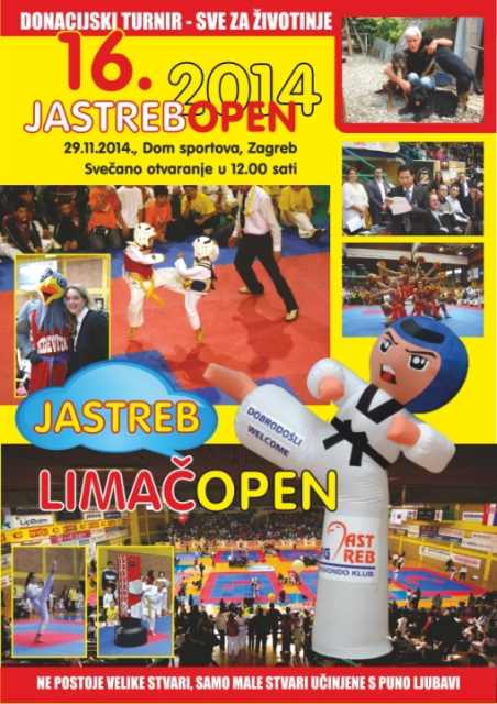 U subotu, 29. studenog s početkom u 12,00 sati, u Dvorani 2 Doma sportova održati će se 16. Jastreb Open, tradicionalno međunarodno taekwondo natjecanje za djecu i mlade u Hrvatskoj. Na Jastreb Open-u ove godine nastupit ce 900 natjecatelja iz 64 kluba iz tuzemstva i inozemstva, čime već tradicionalno ovaj turnir spada u najveća taekwondo natjecanja za djecu u ovom dijelu Europe. Protokol svečanog otvaranja u nazočnosti brojnih medija i osoba iz kulturnog i javnog života grada i države započet će u uz Zagrebačke mažoretkinje, Cedevitasice i službenu voditeljicu programa Karmelu Vukov-Colić. 16. Jastreb Open otvoriti će veleposlanik Republike Koreje, domovine taekwondo sporta Nj.E. Suh Hyung-Won.